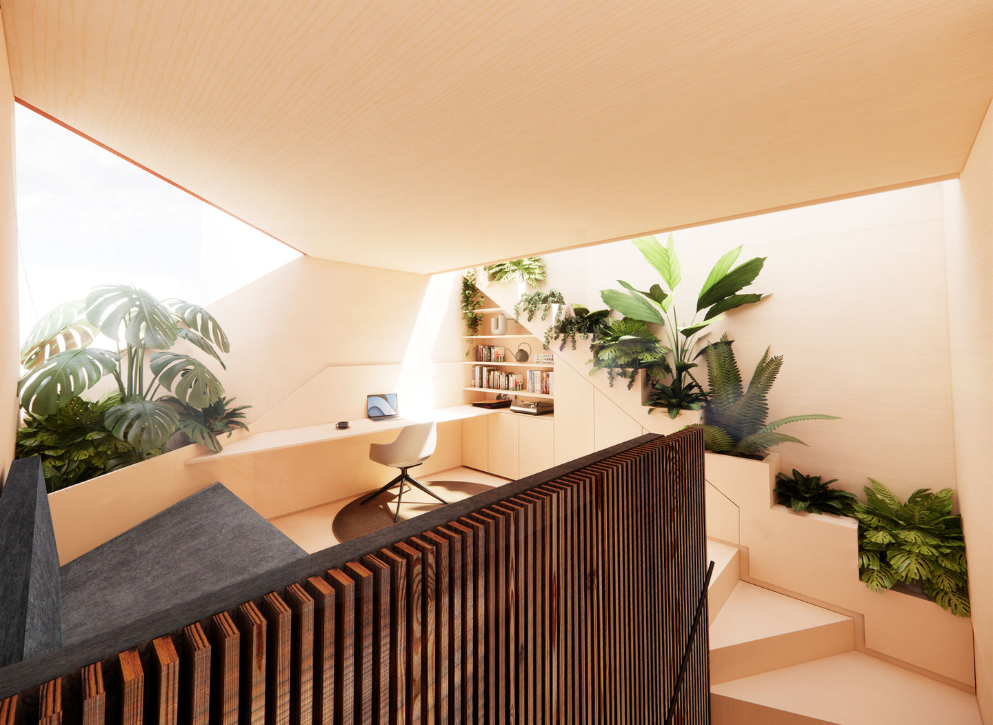 A home studio on the first floor is accessed by a Cross laminated timber bespoke staircase. This open plan studio space filled with light, complete with a stepped planters for tropical plants.