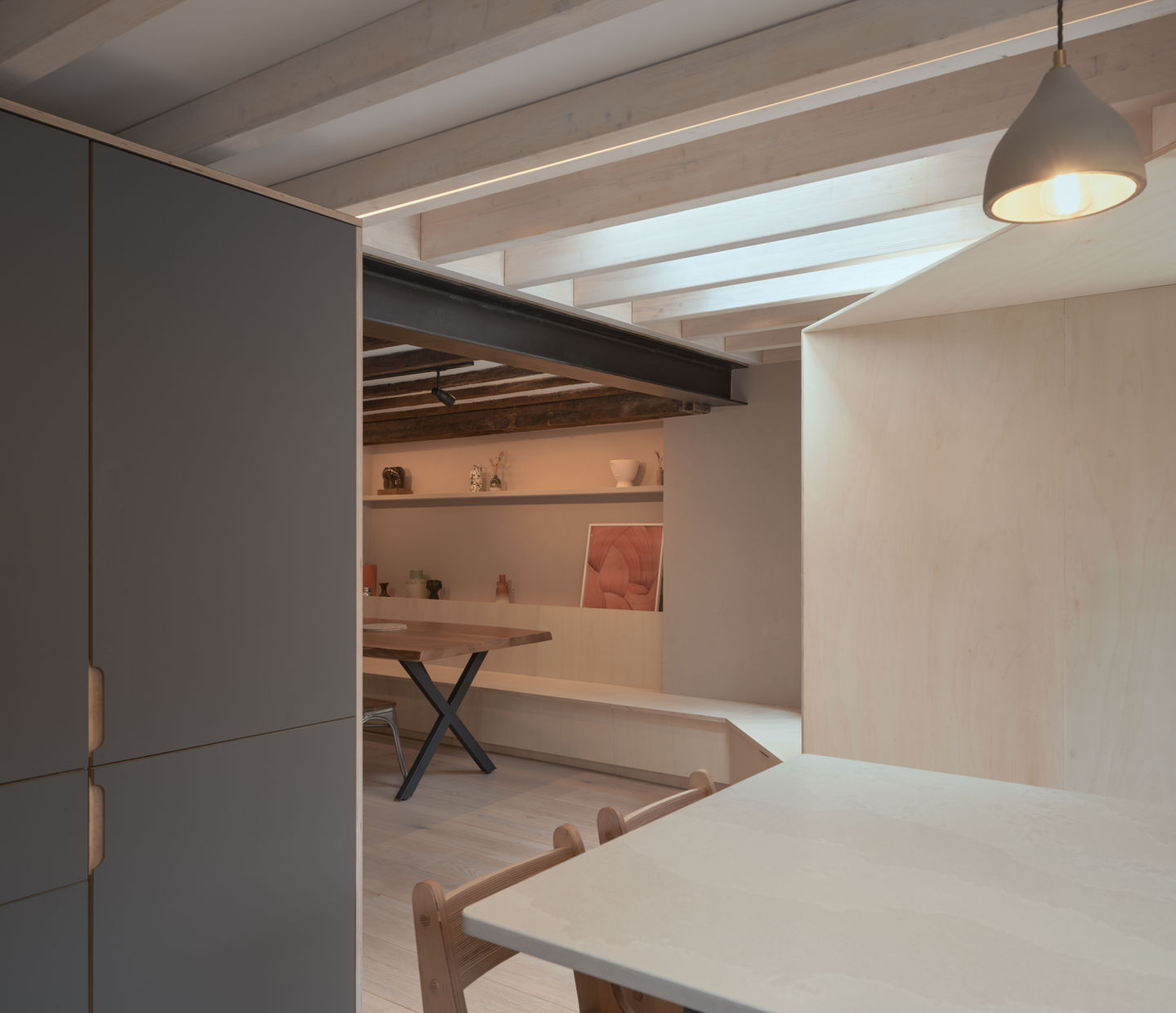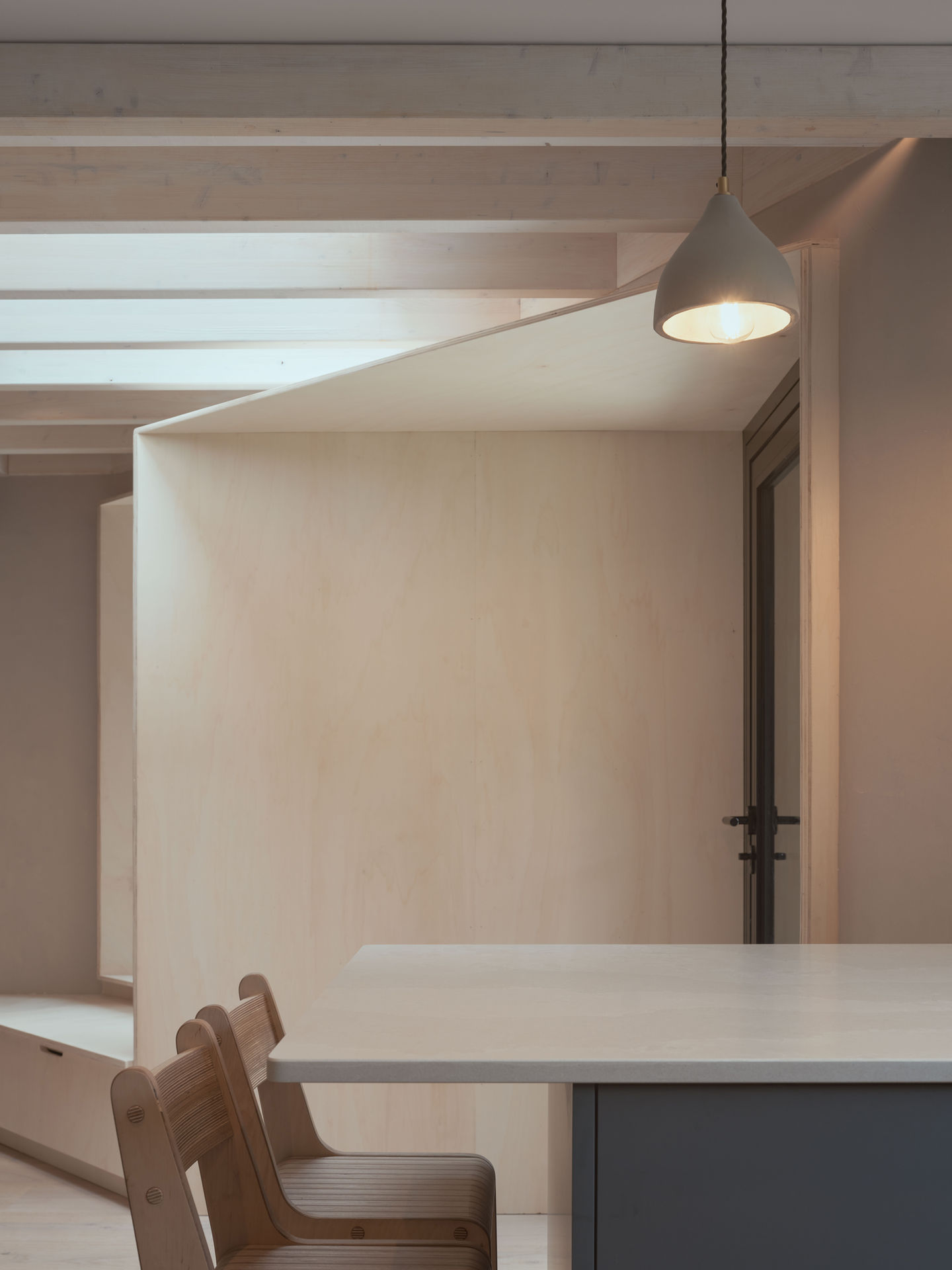 The dining space uses a wraparound bench which morphs with the interior oversized reveals of the window and door. All fabricated from poplar plywood the space is a haven for muted tones, picking up subtle changes of light and shadow throughout the day.